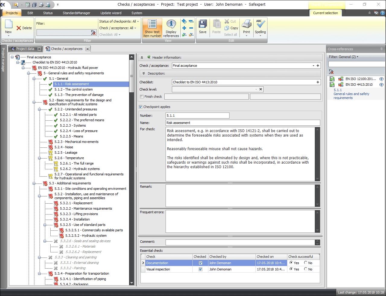 This checklist is used for check or acceptance of hydraulic systems and their components in accordance with the harmonized standard EN ISO 4413:2010. During production of the checklist, the checkpoints that appear to be essential from all sections of the standard were included in the checklist. During product check the inspector documents for each individual checkpoint whether the requirements have been met. Check results can be documented in text form or with photos.
