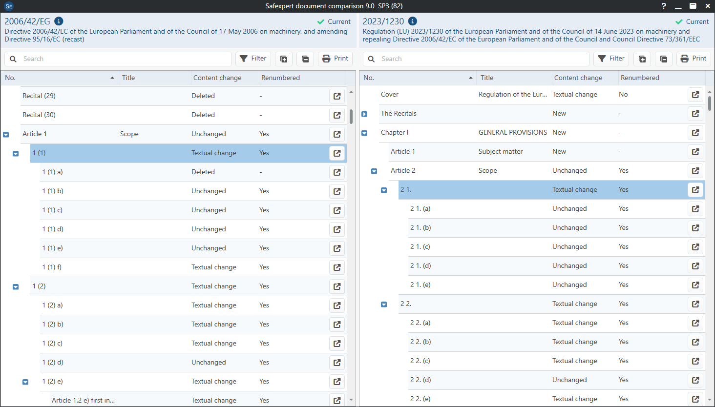 Figure 5: Safexpert document comparison as an interactive correlation table for the Machinery Directive and Machinery Regulation