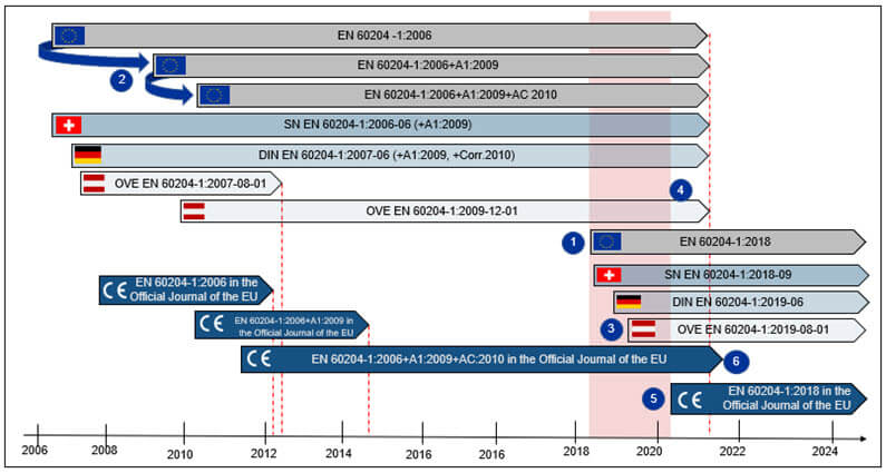 Chronology of EN 60204-1 with the documents published for the standard. The focus here is on EN 60204-1:2018 using the example of the national publications by Austrian Standards: