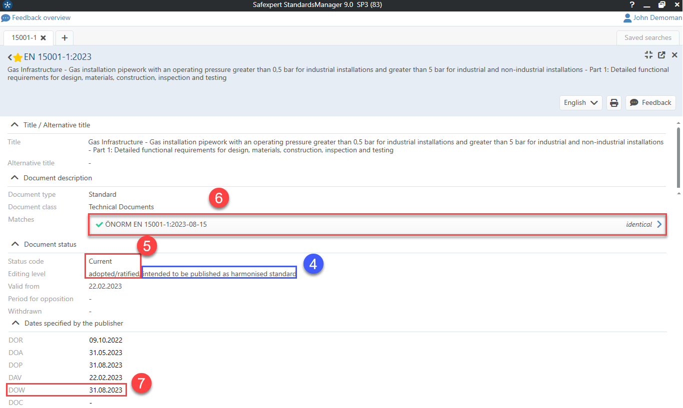 Note the DOW (=date of withdrawal), which is assigned by CEN (7): this specifies the date on which national editions that conflict with the current European version must be withdrawn. The date specified here for EN ISO 13857:2019 is 15 April 2020, the date on which ÖNORM EN ISO 13857:2008-08-01 was withdrawn.