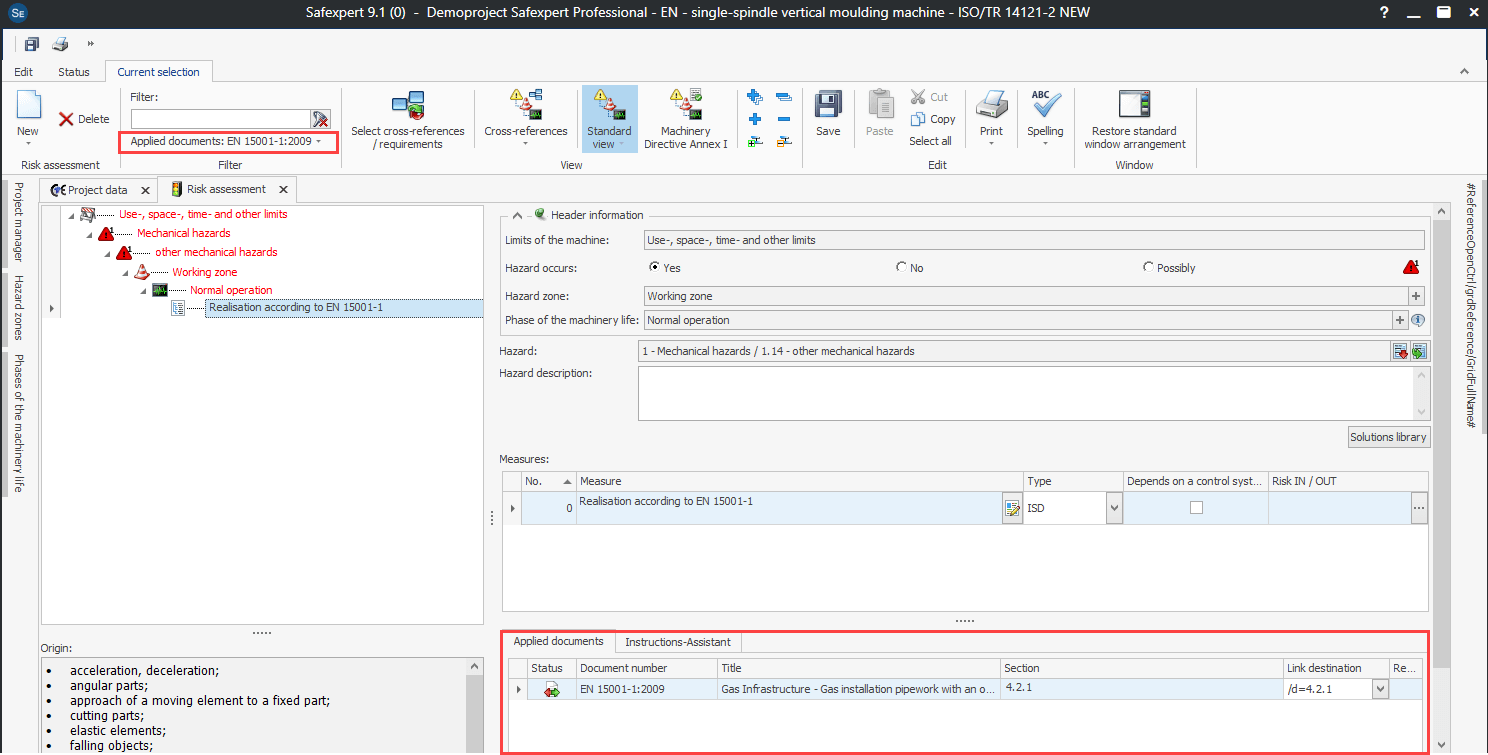 Figure 7 shows a risk assessment in Safexpert. This is filtered so that only those measures are displayed for which EN 15001-1:2009 has been applied. This filter function and the information from the Safexpert StandardsManager can be used to quickly decide whether a new standard requires different measures.