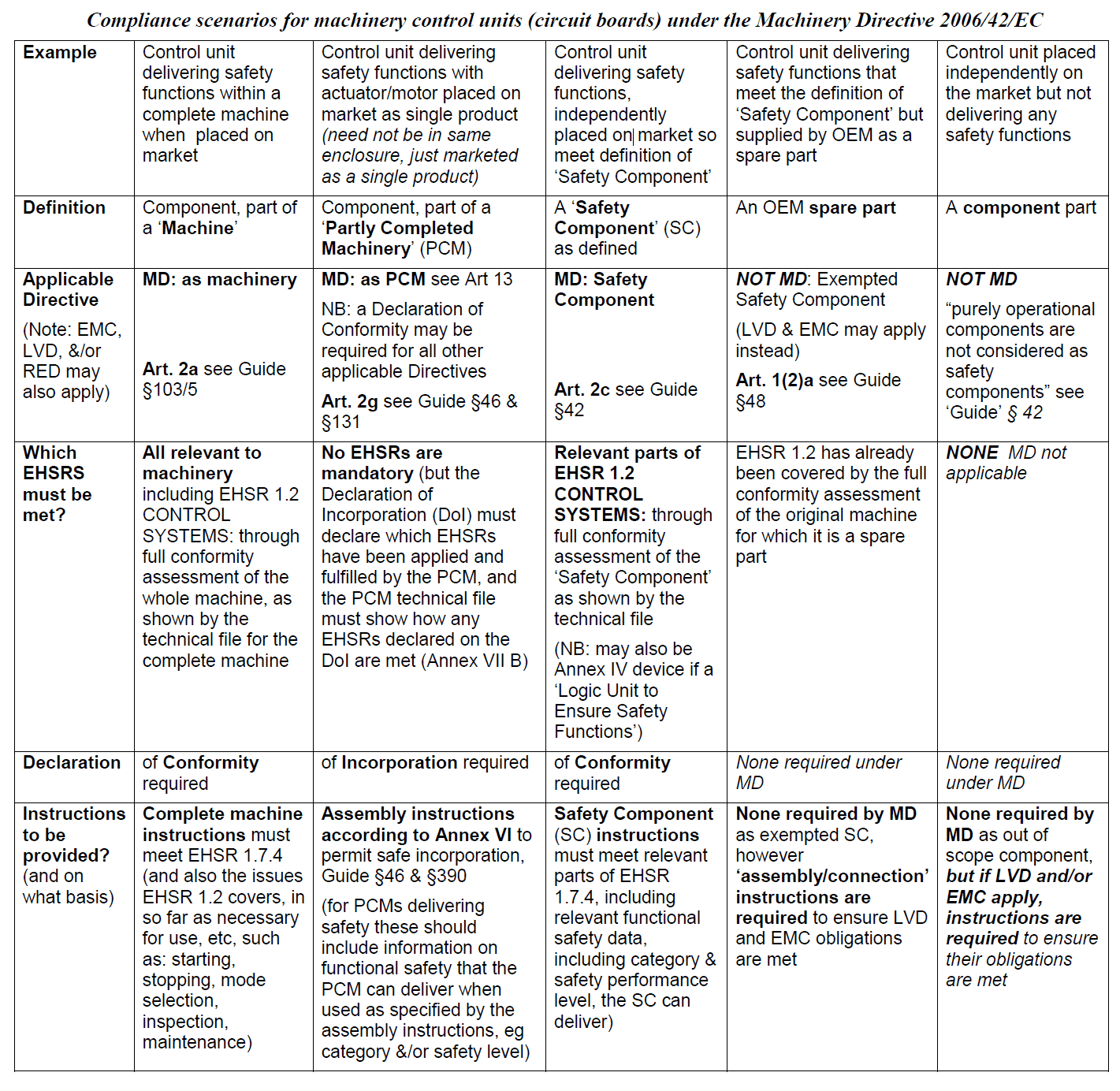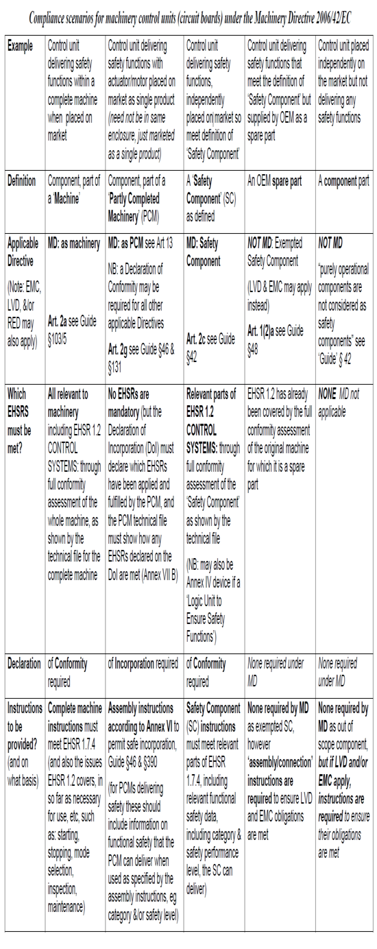 Machinery rely on their control units for their function, which often includes ensuring safety, where failure could result in serious injury or even death. Control units/circuit boards may be placed on the market in a number of ways which affect their status under the Machinery Directive, and the extent to which conformity assessment, the preparation of a technical file and supporting information is required. A number of compliance scenarios are presented here in this table covering the range of situations commonly found so that the legal status of machinery control units/boards when placed on the market either on their own or as part of another product is clear.