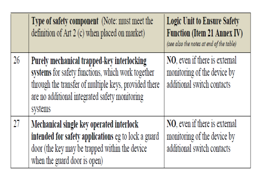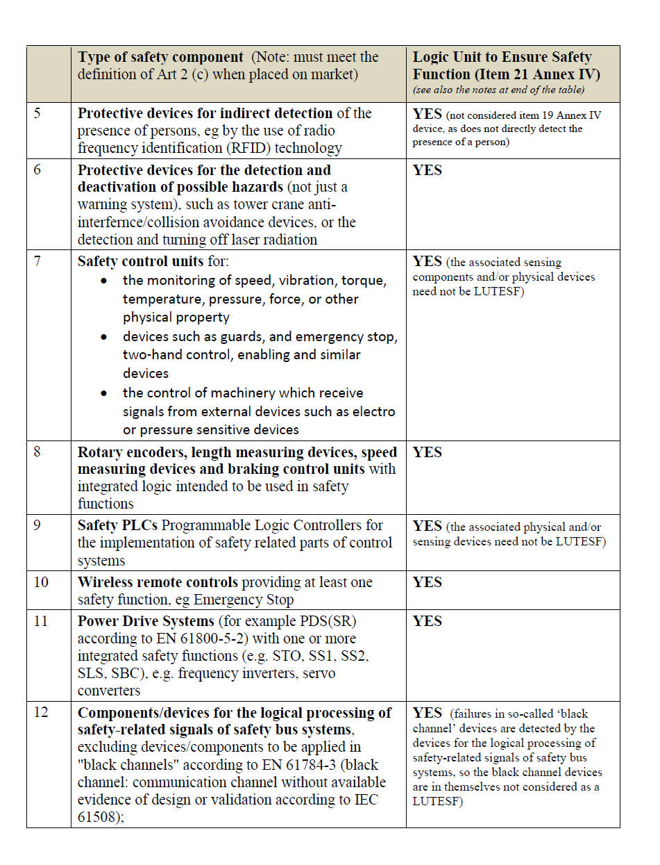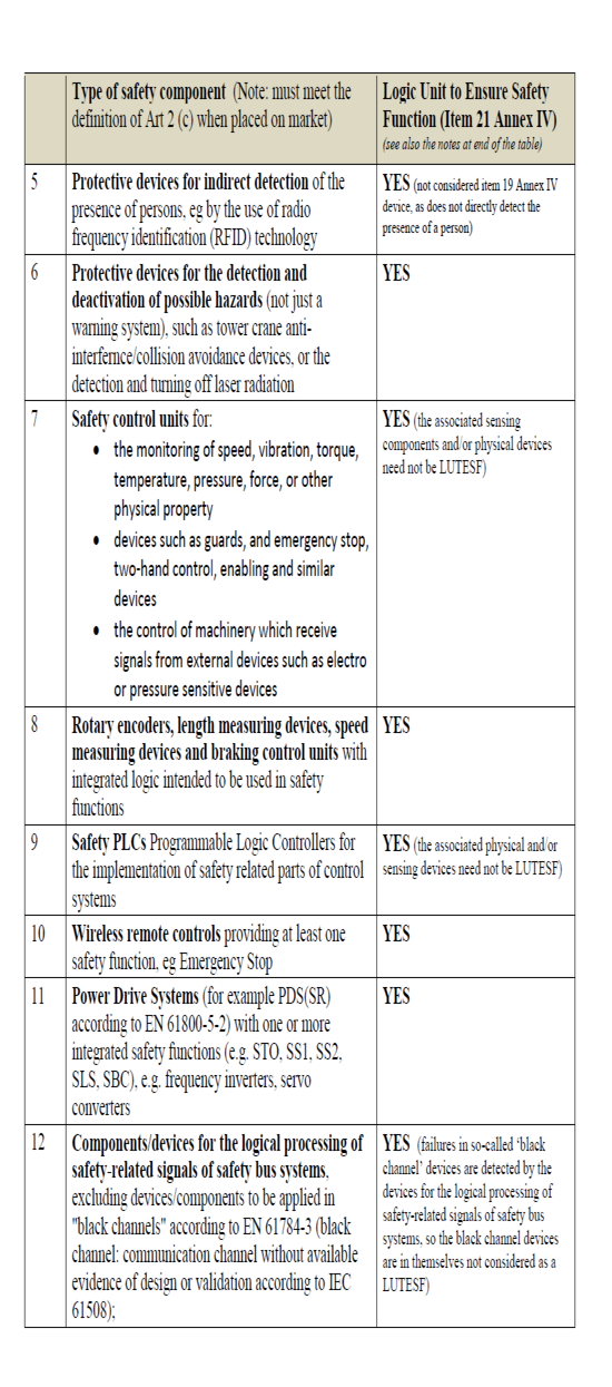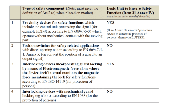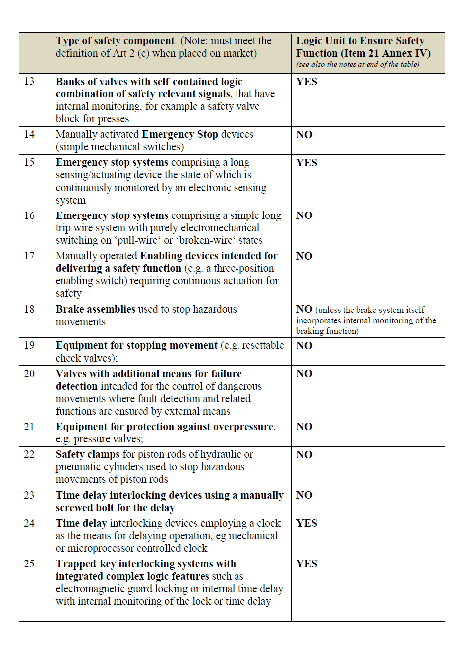 The following non-exhaustive list with accompanying explanatory notes indicate which safety components are considered to be logic units to ensure safety functions in the scope of Annex VI, Item 21, and which are NOT considered to be logic units to ensure safety functions (see also the comments at §388 item 21 on categories of machinery that may be subject to one of the conformity assessment procedures involving a Notified Body).