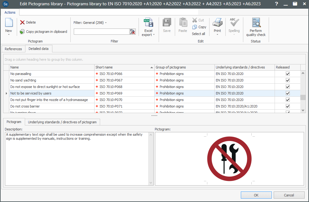 The pictogram library according to EN ISO 7010 is included in the Safexpert Compact and Professional modules and is continuously updated for these customers.