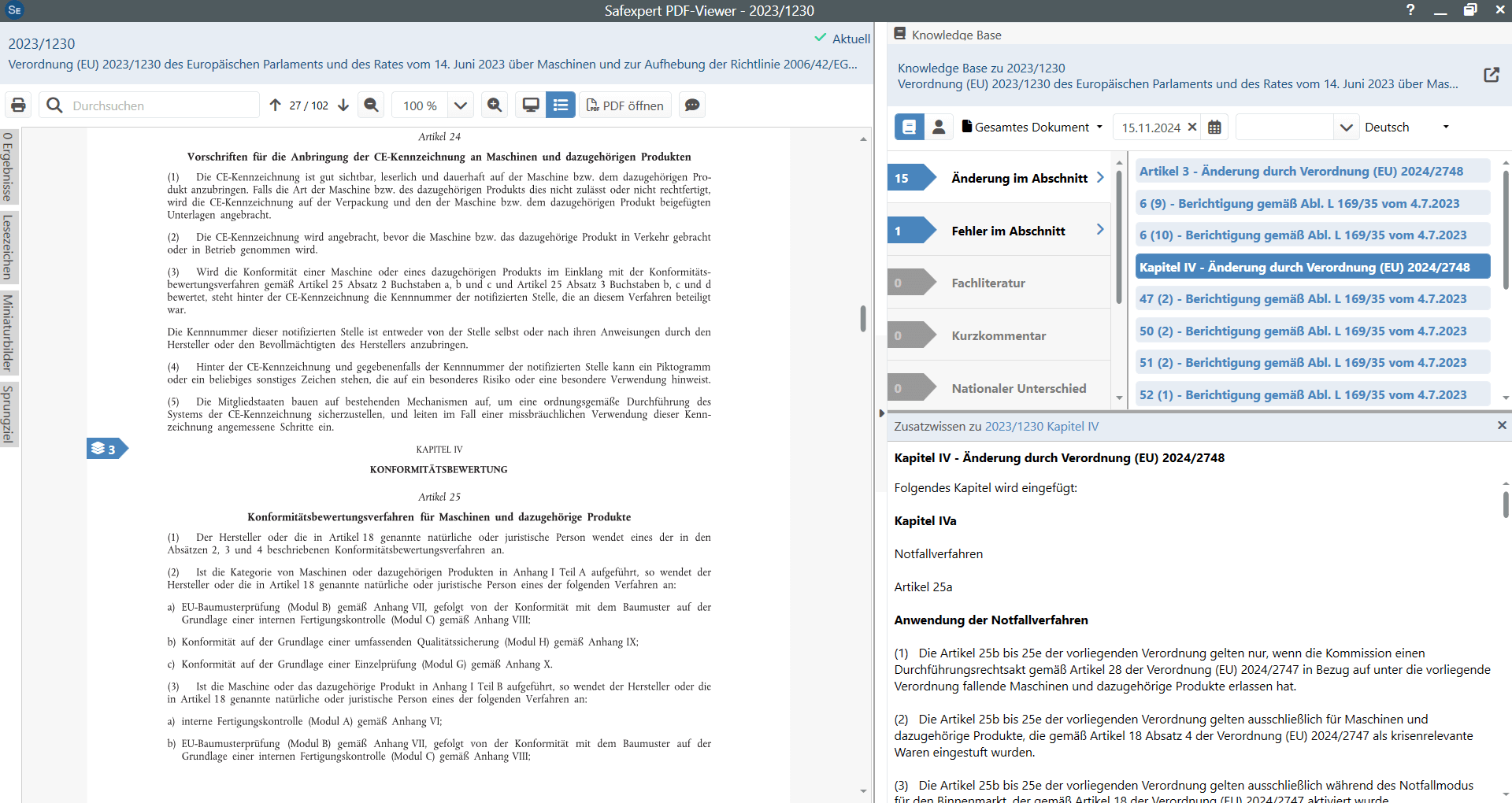 Tipp: Für Safexpert-Anwender sind die geänderten Abschnitte als Einträge in der Knowledge Base verfügbar! So können Sie parallel zum Studium der Verordnung via Textmarken direkt die Änderungen der betroffenen Abschnitte am Seitenrand einsehen. Die Knowledge Base können Sie kostenlos nutzen, sofern Sie den Safexpert NormManager lizensiert haben. In weiterer Folge werden Ihnen sämtliche Änderungen zur Verordnung direkt im PDF-Viewer angezeigt.
