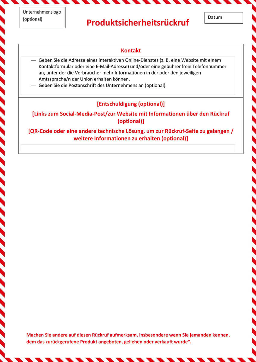 Die Vorlage orientiert sich in ihrem Inhalt an den verpflichtenden gesetzlichen Vorgaben und hebt den Inhalt durch den Einsatz von roter Schrift hervor. Darüber hinaus bietet sie den Wirtschaftsakteuren die Möglichkeit, die Rückrufanzeige um optionale Informationen zu erweitern; dazu zählen z.B.