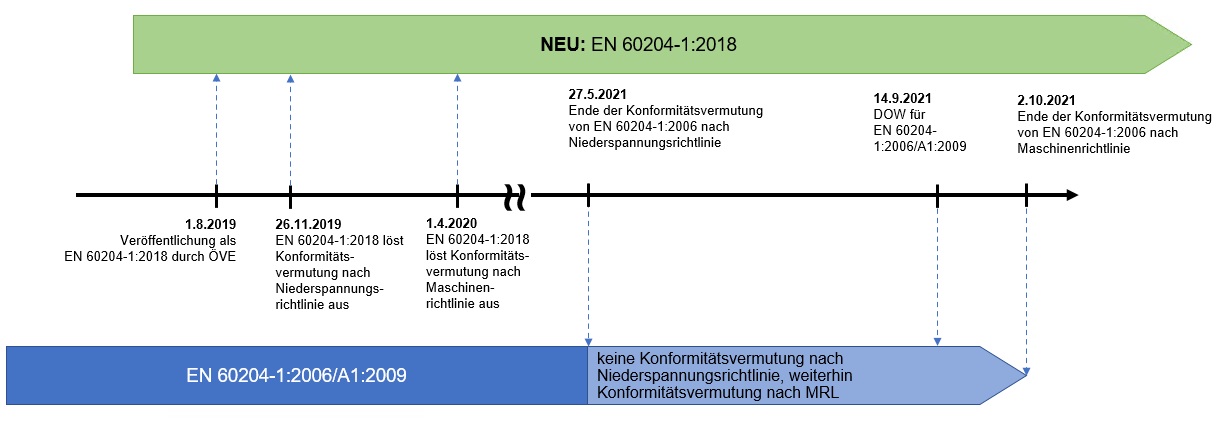 Update 2.10.2021: Am 2.10.2021 endete die Konformitätsvermutung für die Vorgängernorm EN 60204-1:2006 (inkl. A1:2009 und AC:2010) auch nach Maschinenrichtlinie. Somit erfüllt ab sofort ausschließlich die Nachfolgenorm EN 60204-1:2018 die Konformitätsvermutung.