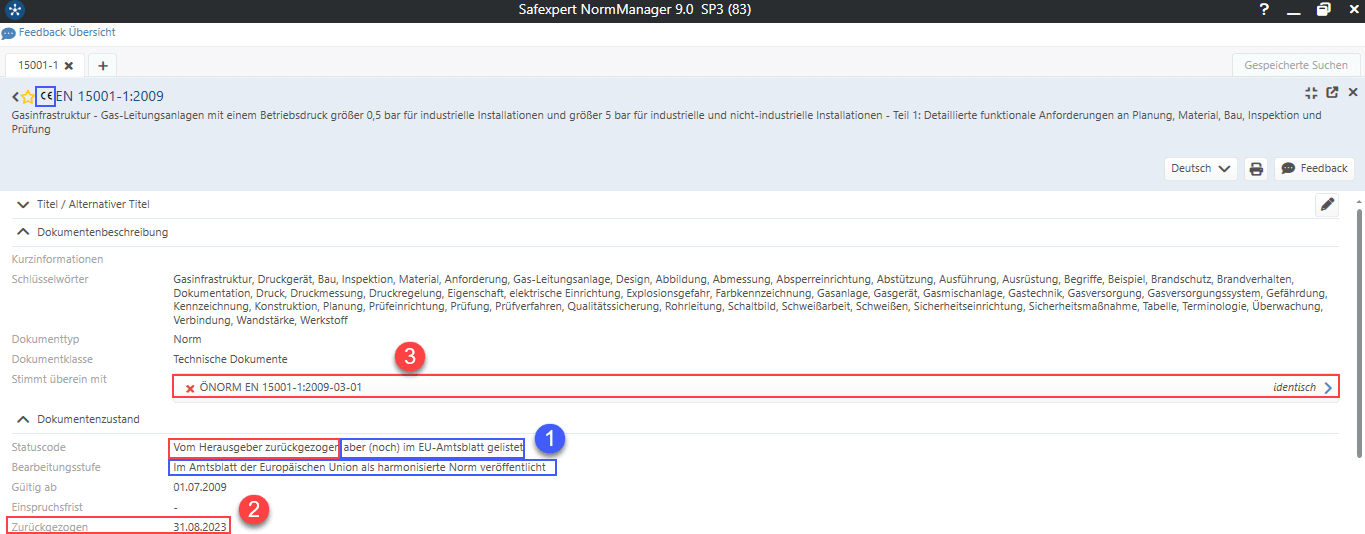 EN 15001:2009 ist z.B. zum Zeitpunkt des Erscheinens dieses Beitrages als harmonisierte Norm nach der Druckgeräterichtlinie im EU-Amtsblatt gelistet (1). Allerdings ist das Dokument vom Herausgeber bereits zurückgezogen (2). Das nationale Dokument (3) ist ebenfalls als zurückgezogen markiert.