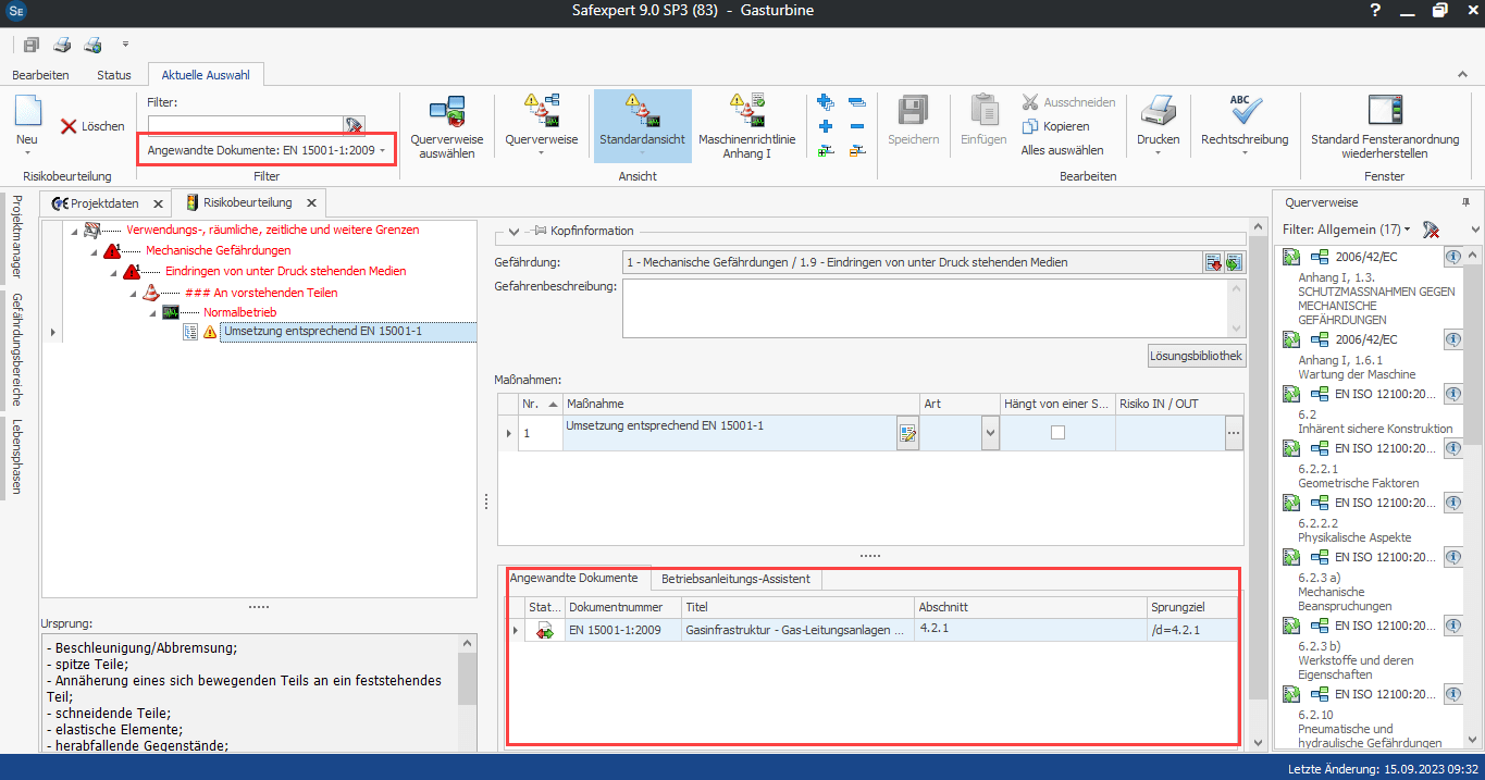 Abbildung 7 zeigt eine Risikobeurteilung in Safexpert. Diese wird gefiltert dargestellt, s.d. nur jene Maßnahmen angezeigt werden, bei denen EN 15001-1:2009 angewendet wurde. Durch diese Filterfunktion und die Informationen aus dem Safexpert NormManager kann rasch entschieden werden, ob eine neue Norm andere Maßnahmen vorsieht.