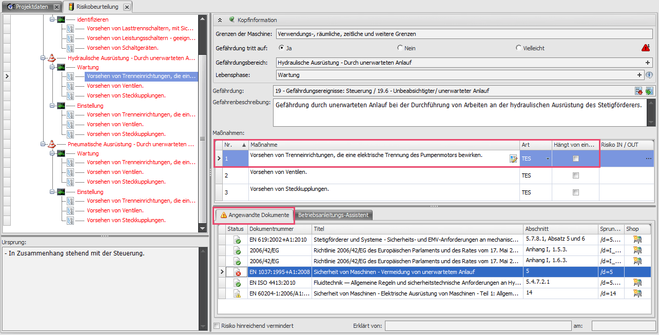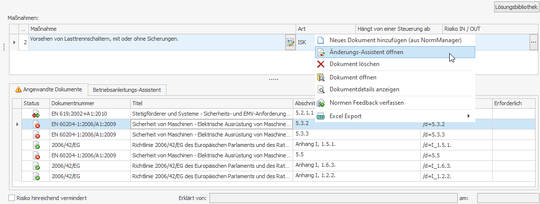 Diese Funktion bietet Ihnen wertvolle Unterstützung sowohl im CE-Prozess als auch in der Risikobeurteilung nach Maschinen- und Niederspannungsrichtlinie. So können Sie Ihre Projekte bei Normenänderungen nicht nur auf Aktualität prüfen, sondern passen eine sicherheitstechnische Maßnahme auf Normenbasis ganz einfach an.