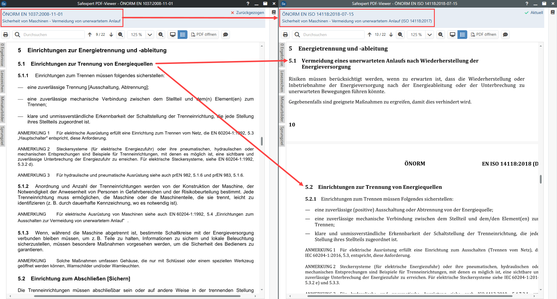 Abbildung 4: Safexpert zeigt beide Normentexte mit einem einzigen Mausklick direkt nebeneinander am Bildschirm an