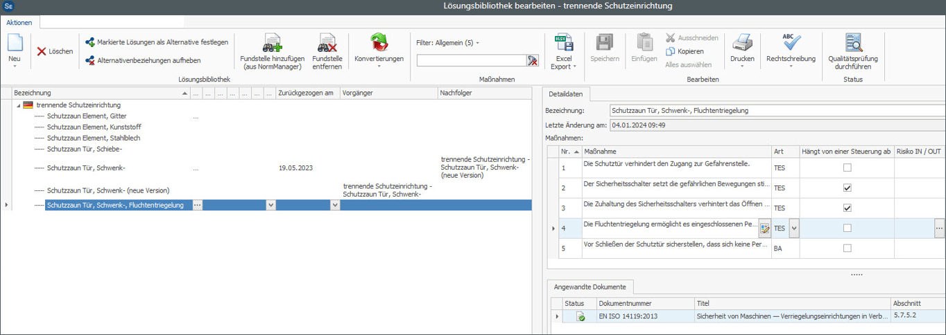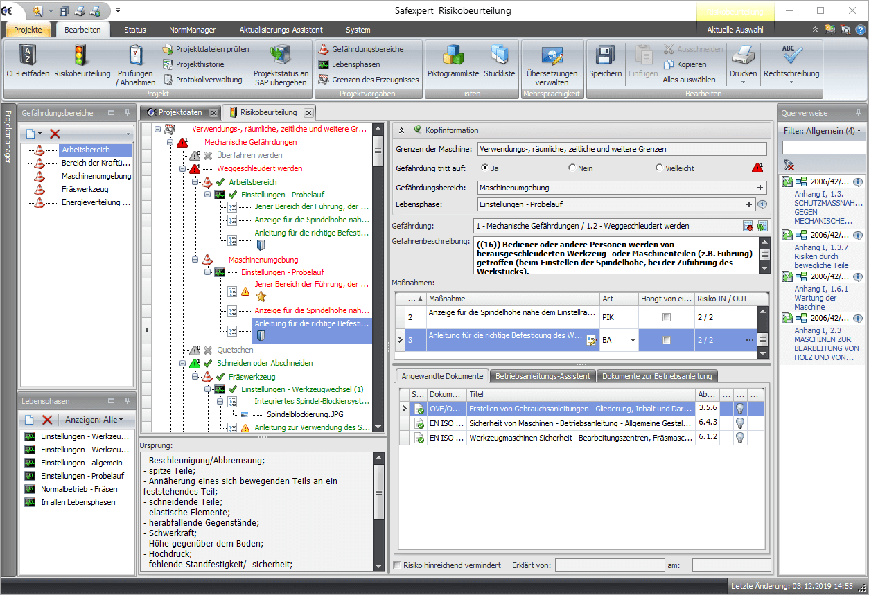 Maßnahmen zur Risikominderung können durch Normenreferenzen ergänzt werden. Dadurch kann Safexpert in Verbindung mit dem Safexpert NormManager automatisch prüfen, welche Maßnahmen in welchen Projekten nicht mehr aktuell sein werden.